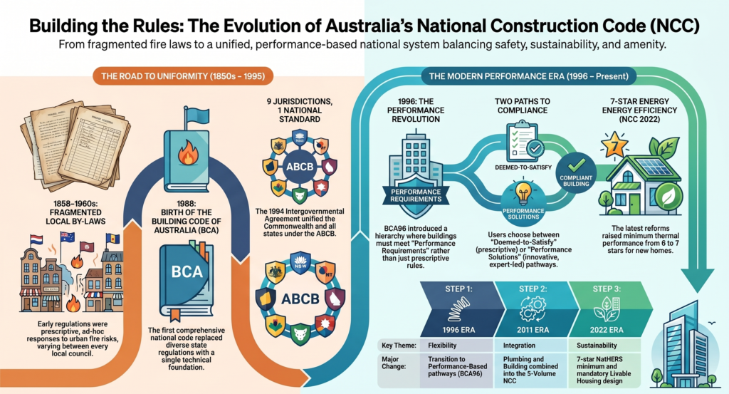 The arc traced in this article extends from the earliest colonial fire ordinances of the nineteenth century — concerned almost exclusively with preventing the catastrophic spread of fire through densely settled timber towns — through more than a century of fragmented, locally administered, prescriptive building by-laws, to the creation of the first national model code in the 1970s and the first genuinely national building code in 1988. The establishment of the ABCB in 1994, the performance-based revolution of BCA96 in 1996, the integration of plumbing regulation in 2011, and the progressive tightening and expansion of the code’s provisions in successive NCC editions represent a sustained and ultimately successful effort to create a regulatory framework adequate to the complexity and diversity of the Australian built environment.